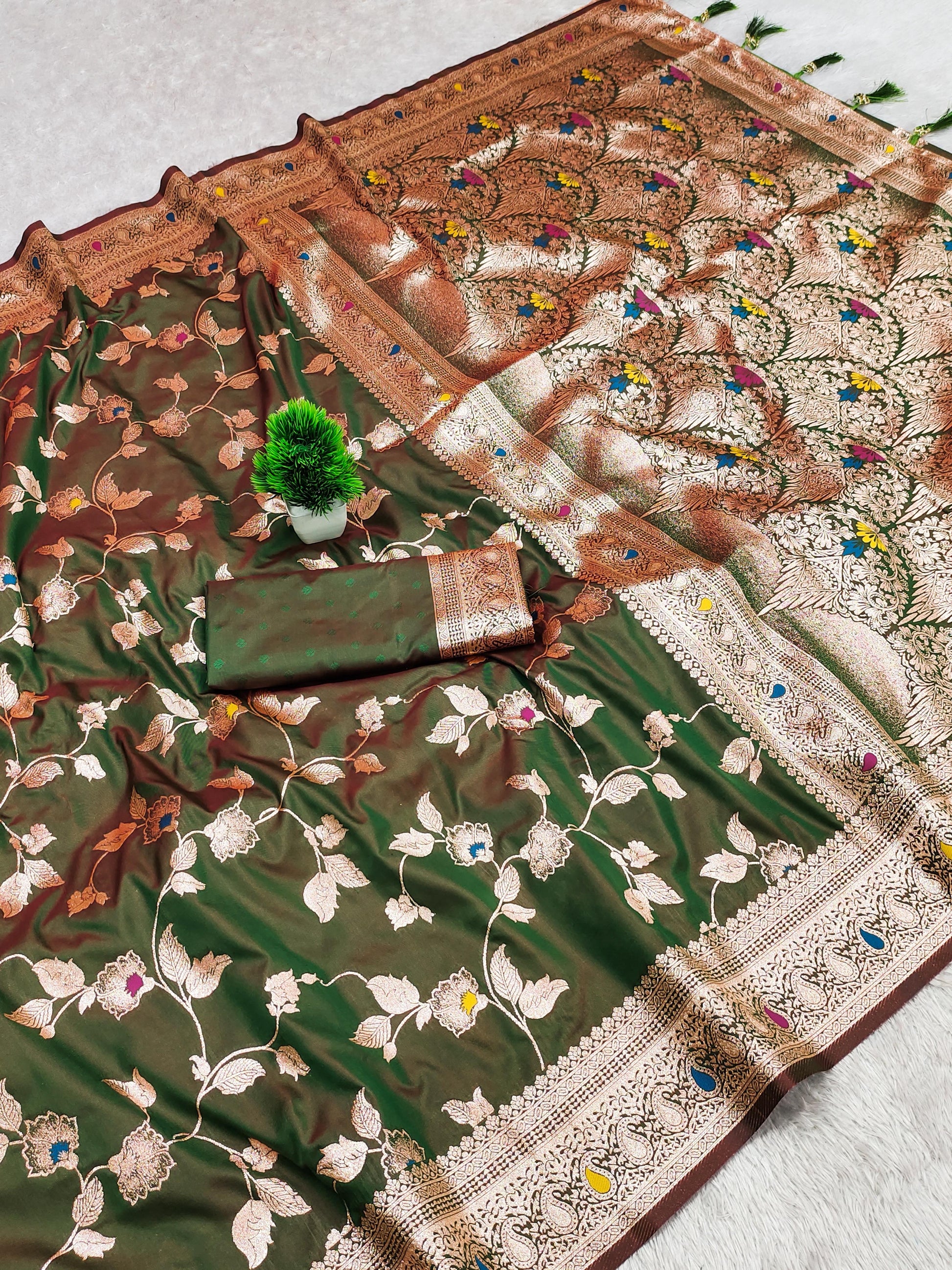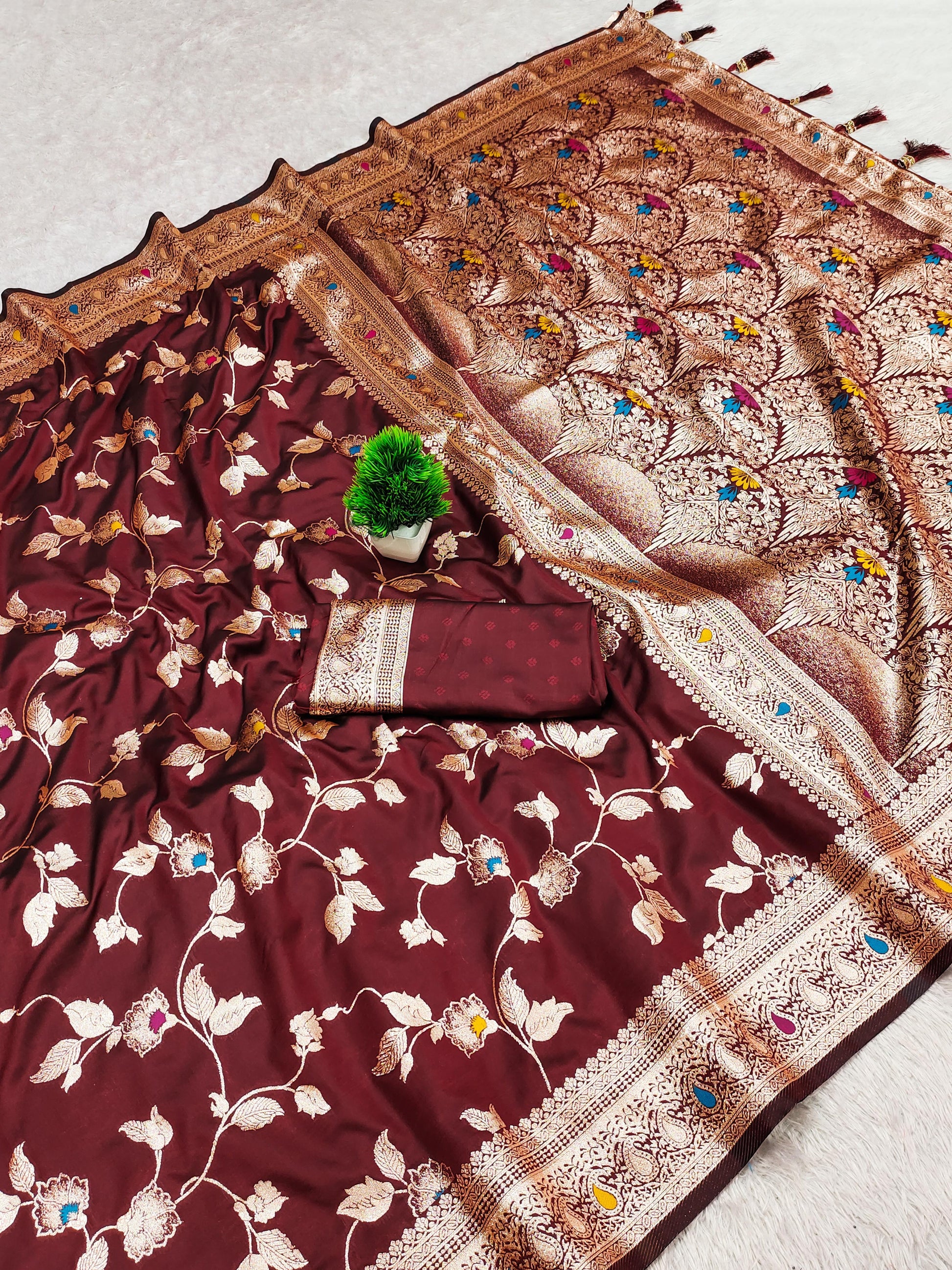 Saree :- Soft Banarasi silk saree with zari weaving Meenakari touchup design all over the saree & Meenakari weawing Rich pallu with Meenakari weawing border & Tassels attached at Pallu End.
