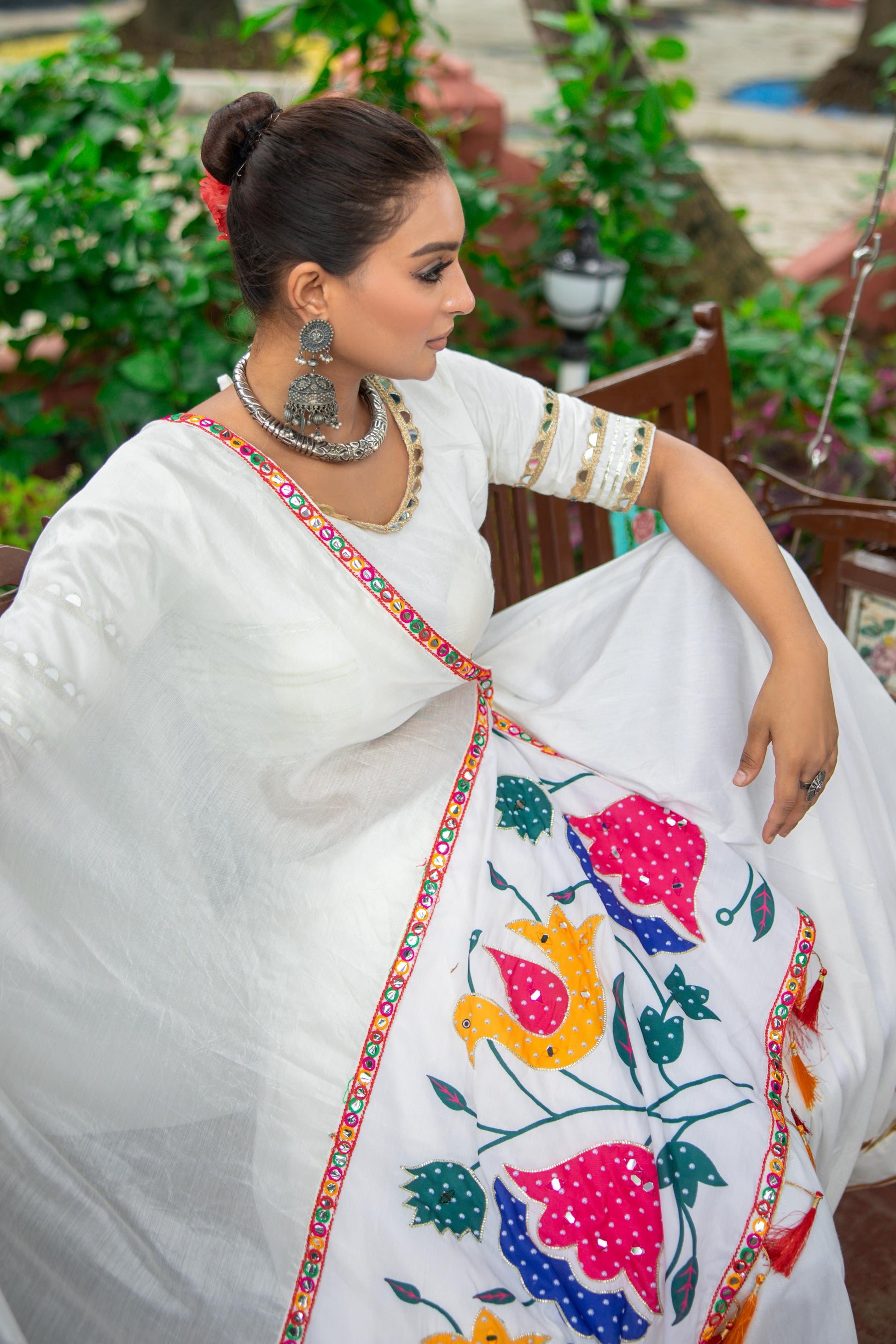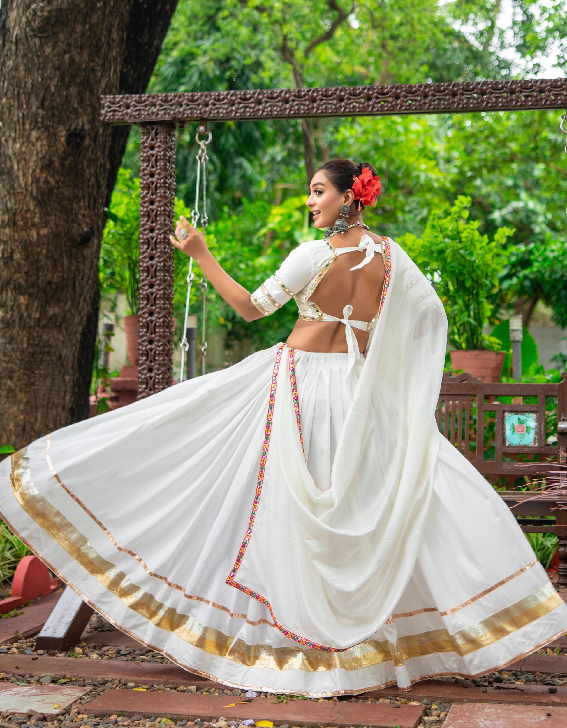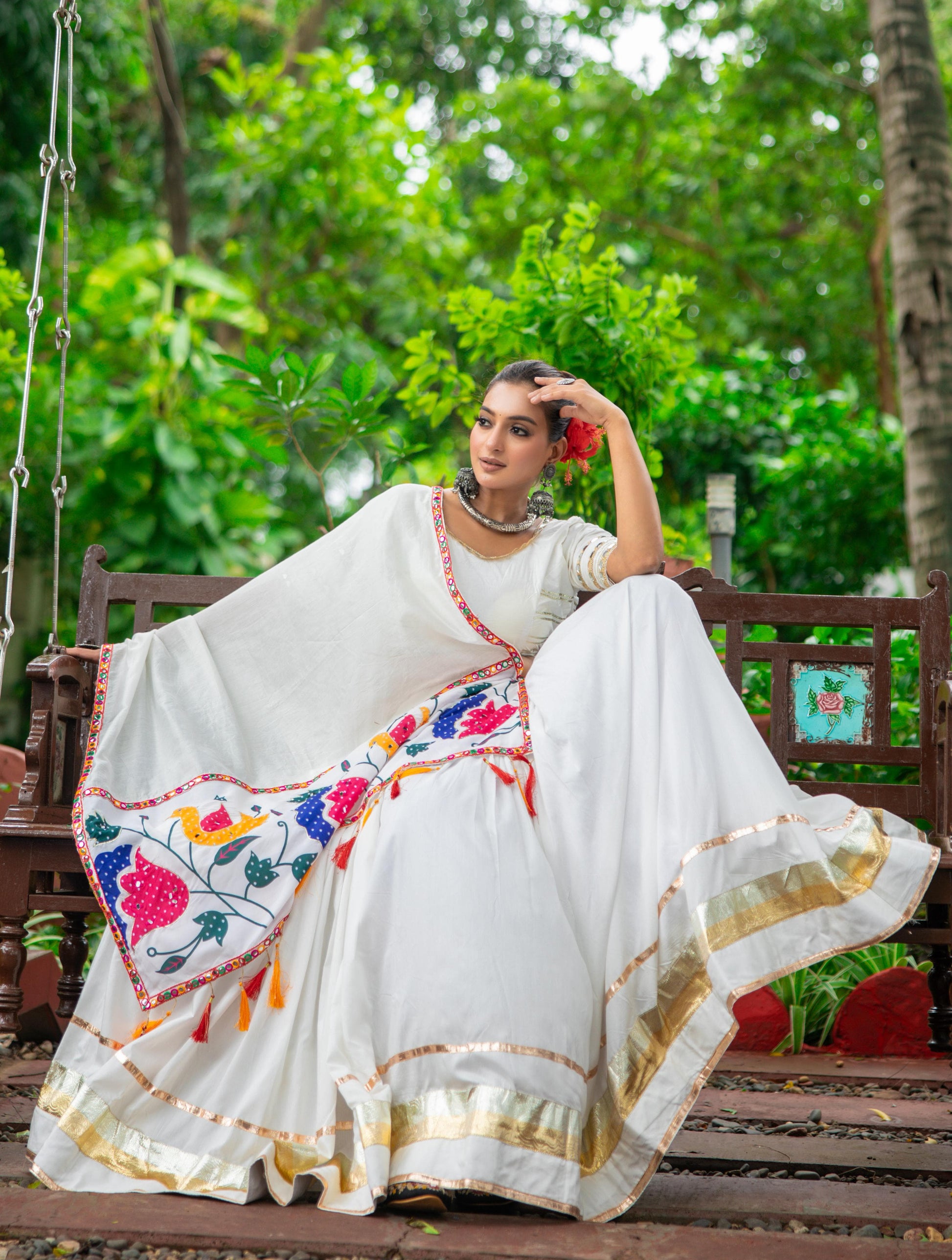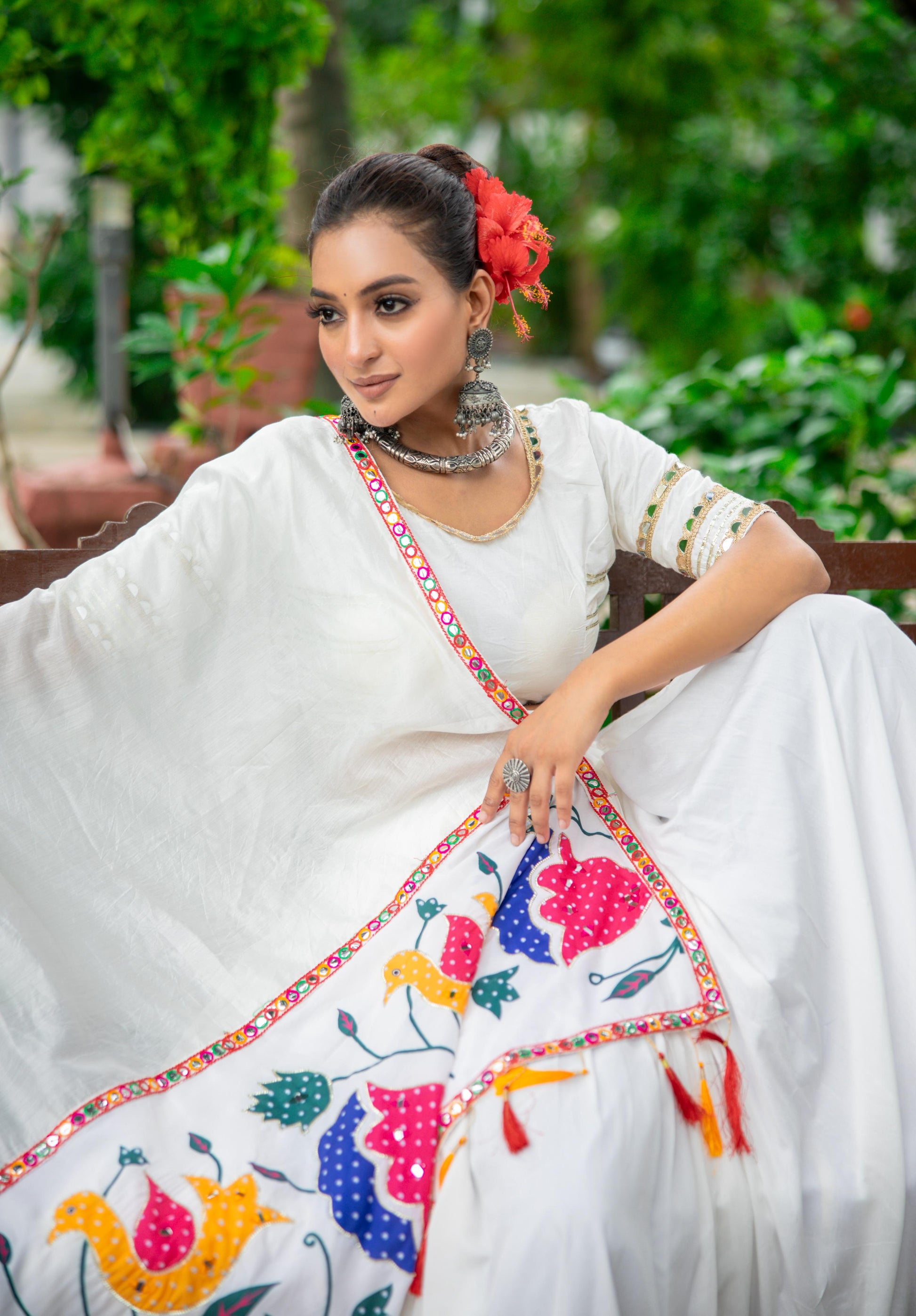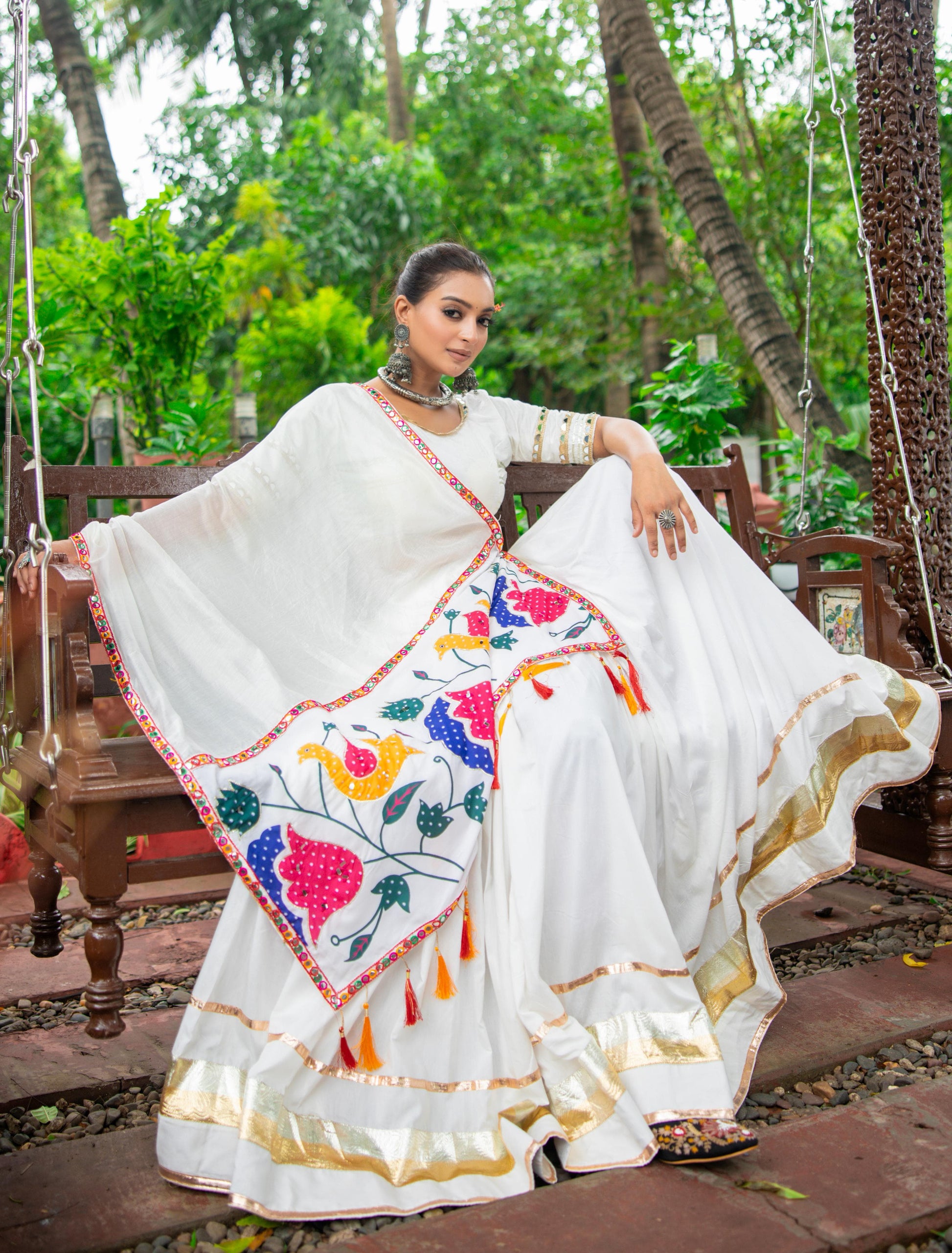 Celebrate the vibrant spirit of Navratri with this elegant and graceful white pure cotton chaniya choli set. Designed for comfort and style, the outfit featuresππ€