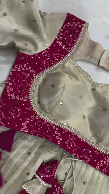 Beautiful Chinnon Silk with Soft Vichitra Blooming Silk Bandhani Print Stitched Embroidered Designer Blouse and Beautiful Sleeves.