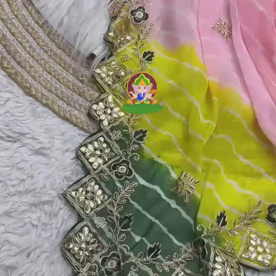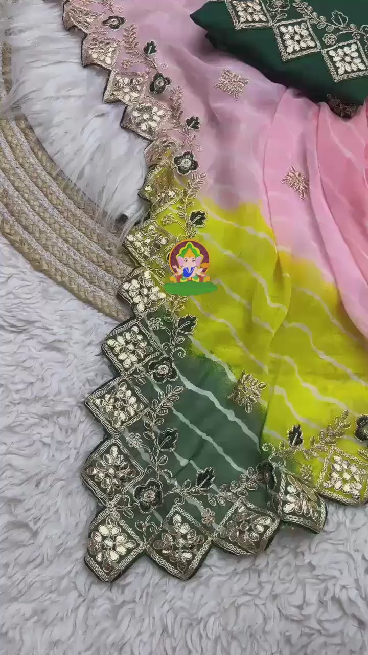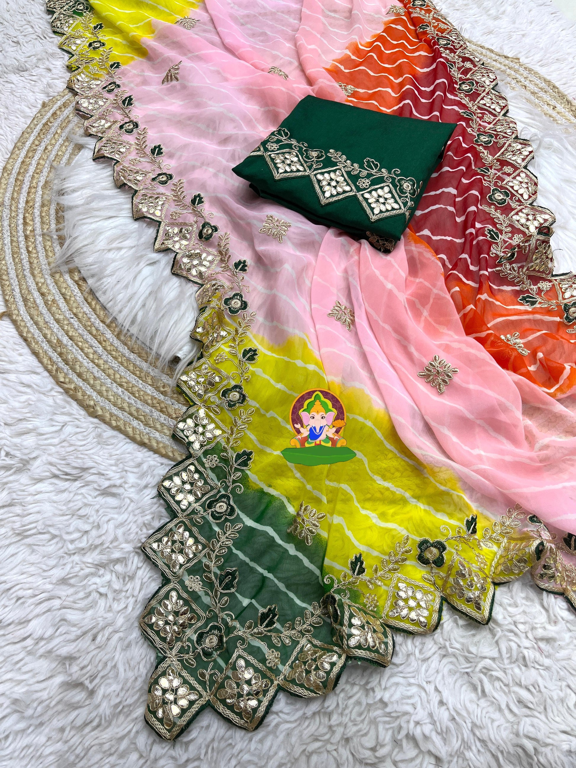 Fabric :- soft peding c*c Georgette multi colour लहरिया with beautiful c-pallu gotapatti multi coding cut work & butti In whole saree