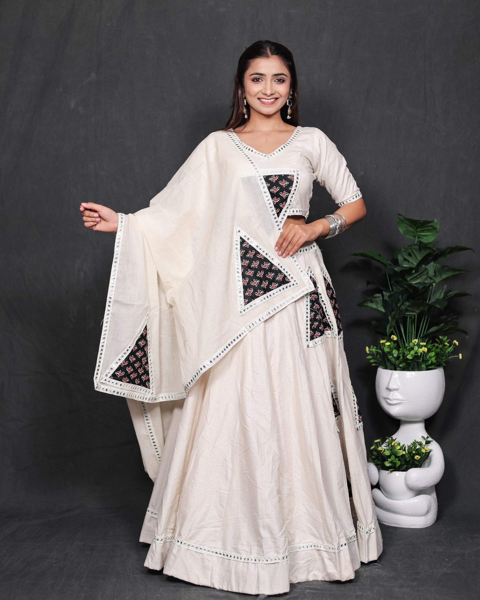 Lehenga Work : Solid Color with patch work of beautiful Ajarakh print with paper Mirror work.