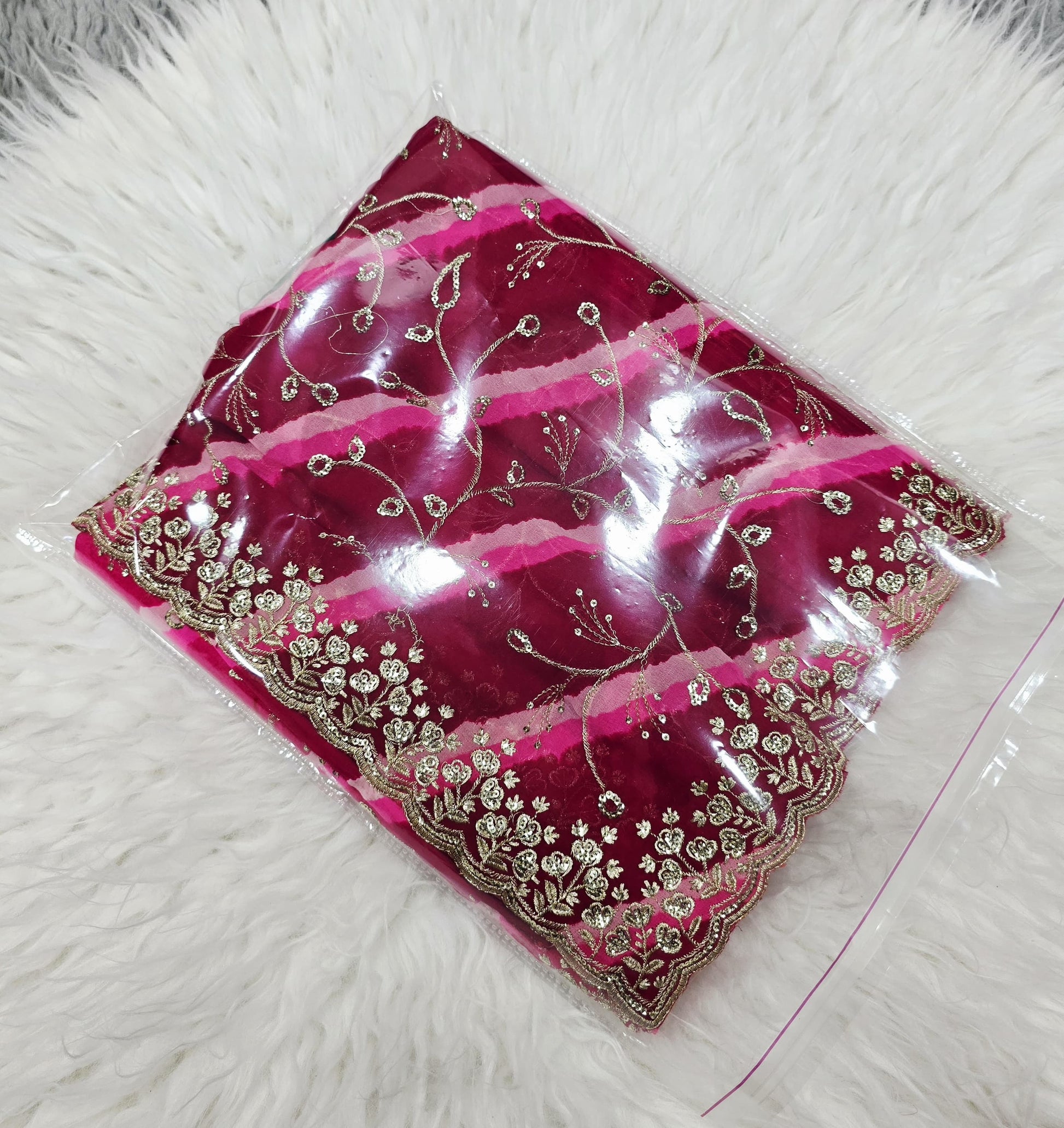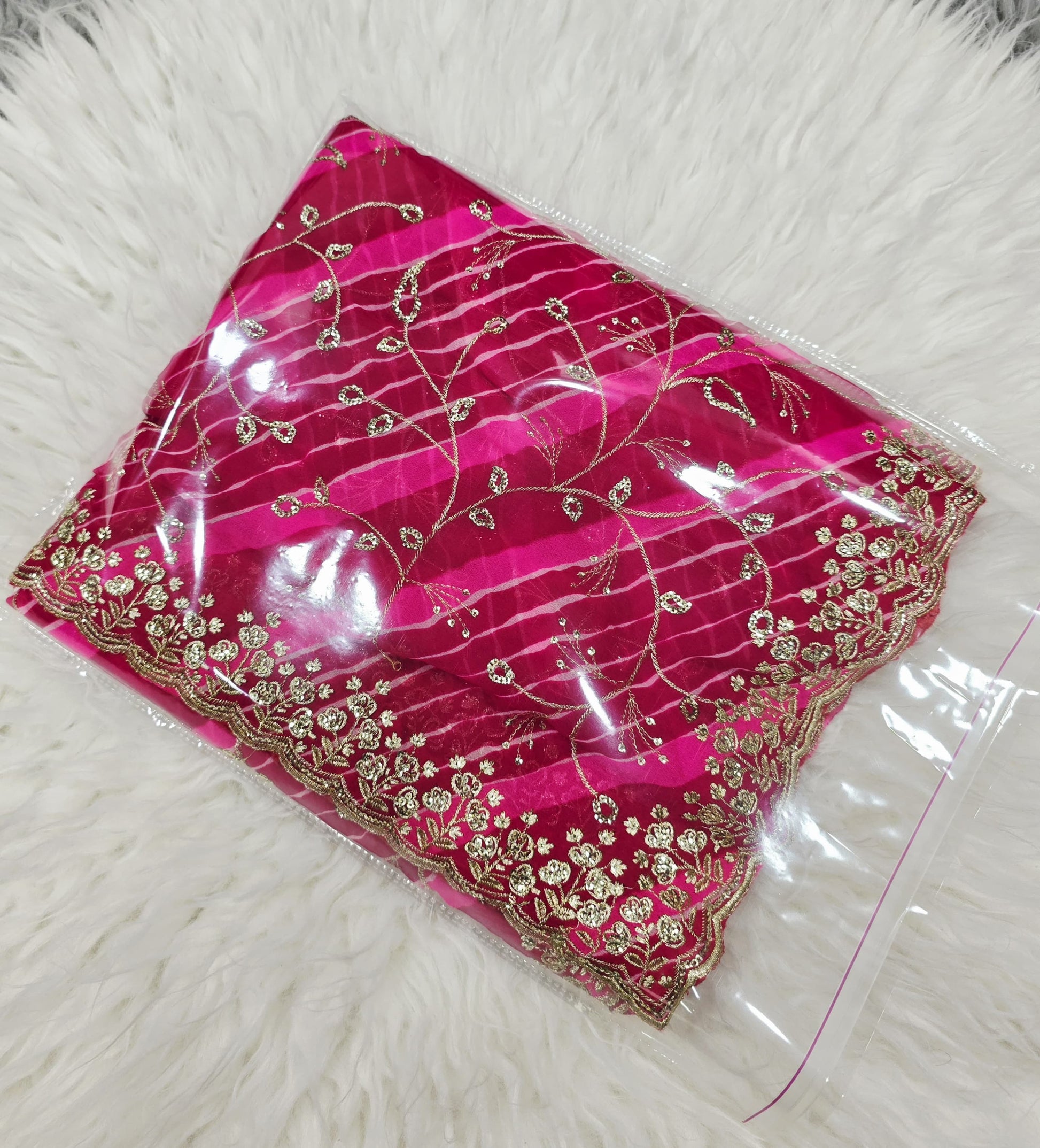 PURE GOERGET C/C FABRIC WITH BEAUTIFUL LEHRIYA PRINT ALL OVER WITH BEAUTIFUL C-PALLU JARIWORK WITH BEAUTIFUL JAAL IN PALLU WITH CUT WORK L& CONTRATS HEAVY WORK BLOUSE . 80 GREEN