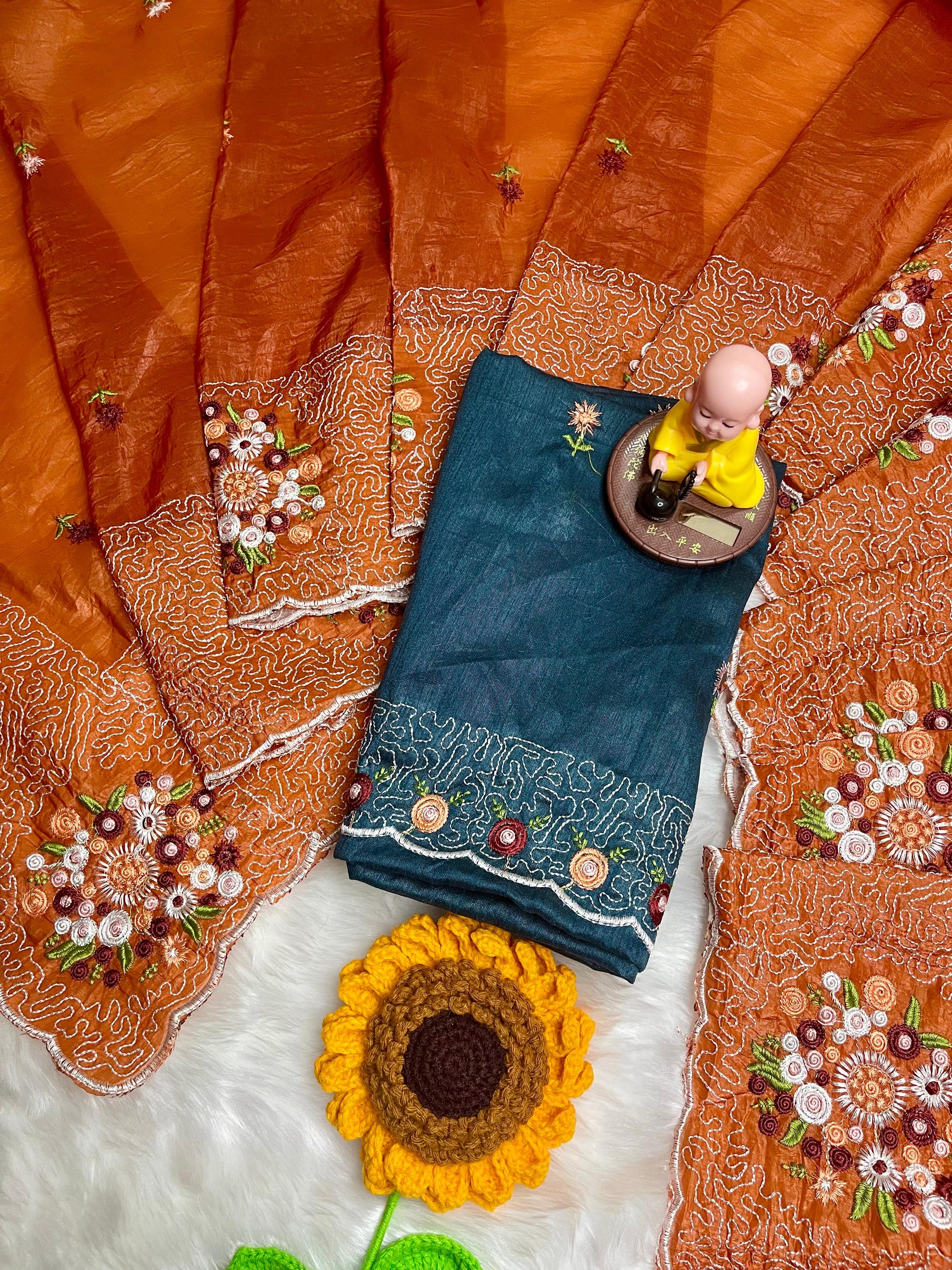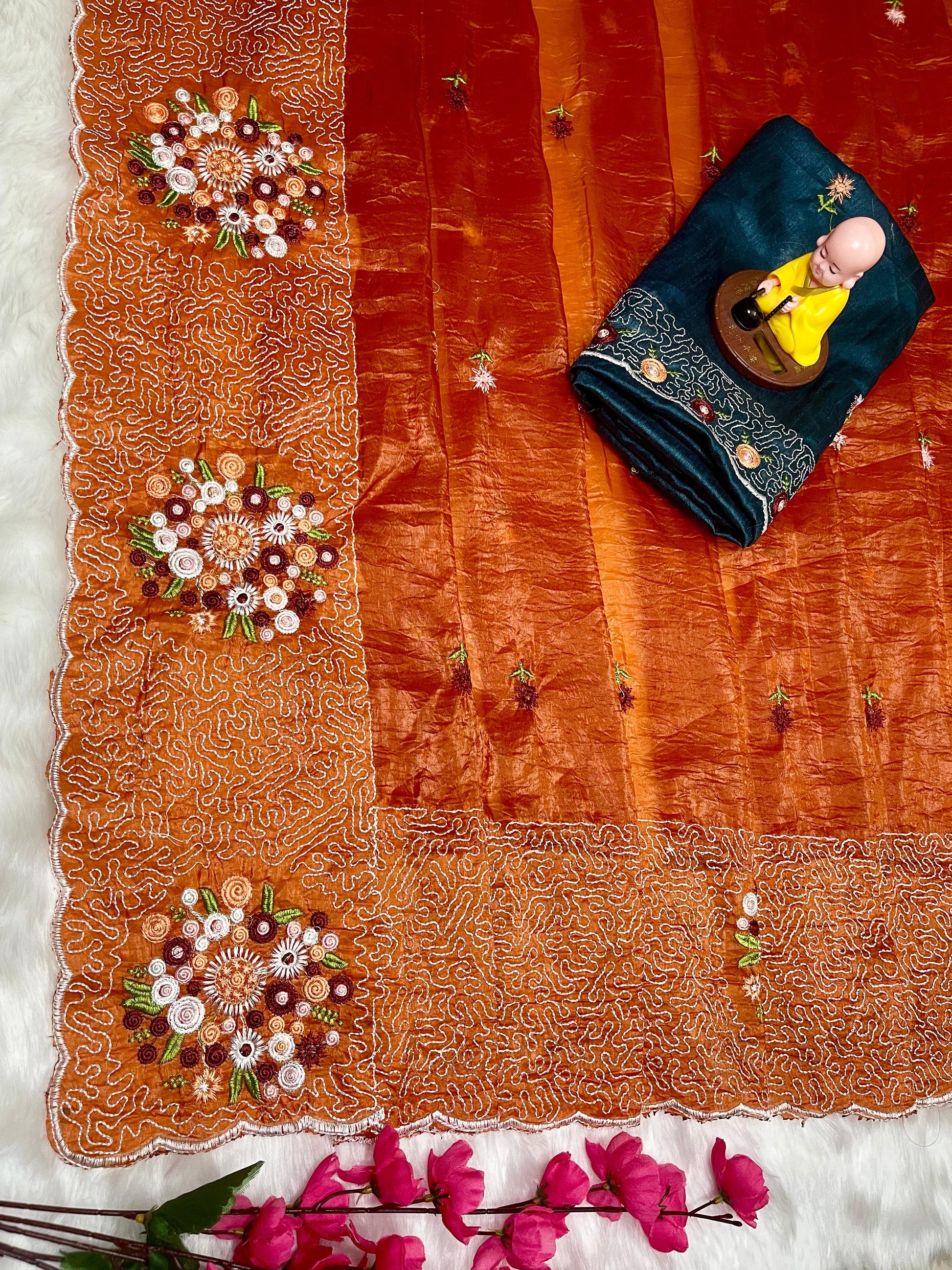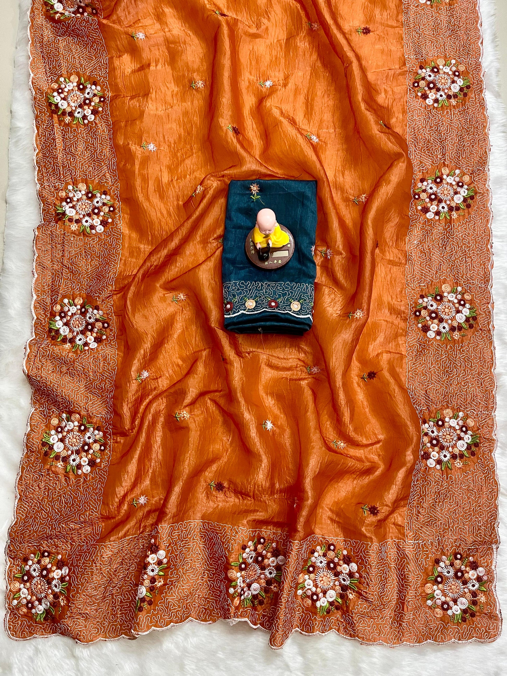SAREES FABRICS*:-Premium Paper Crush silk sarees with Multi thread embroidery work with sequence
