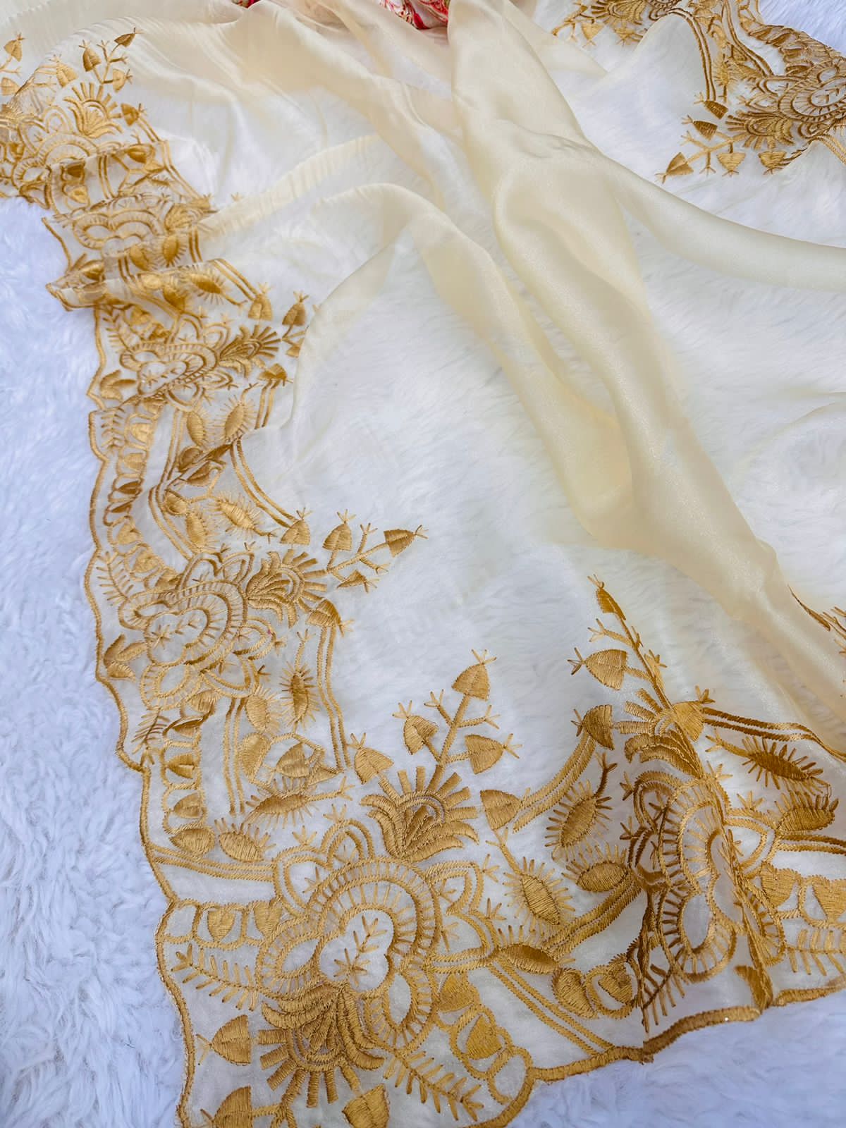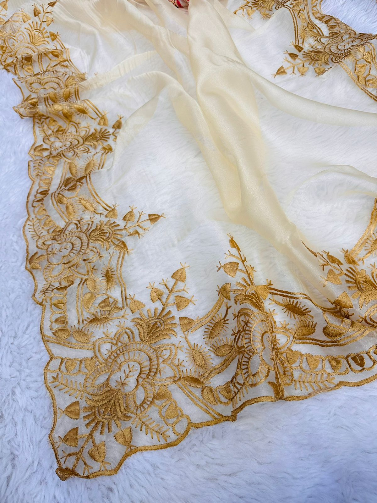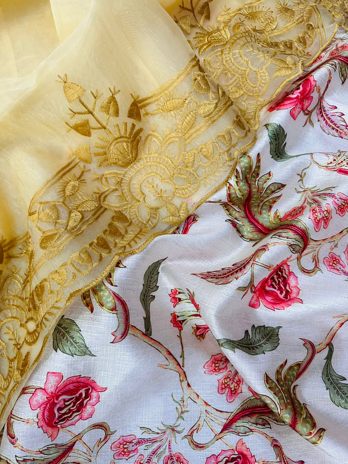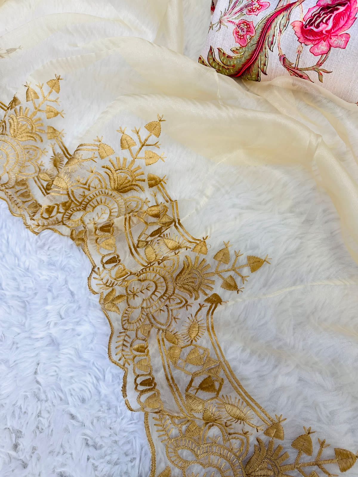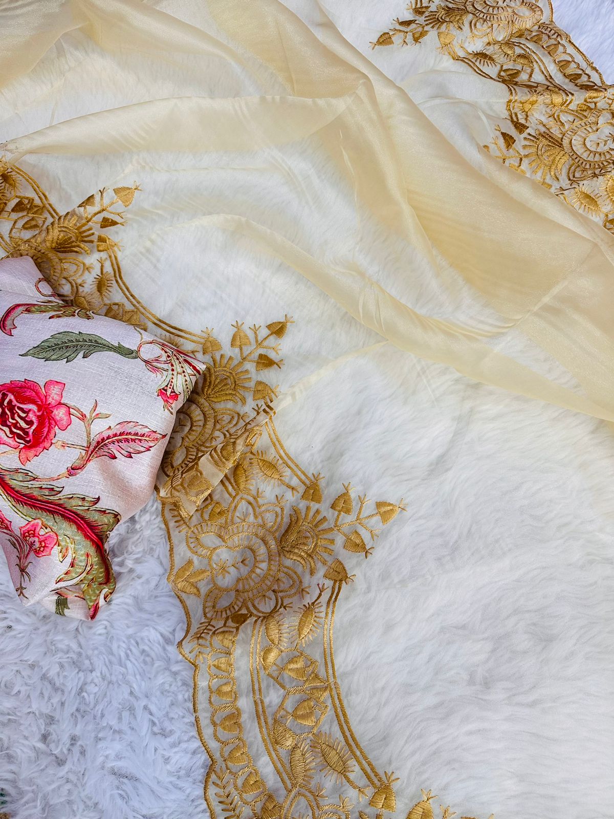 Pure organza saree with heavy embroidery thread work all over and digital print silk blouse