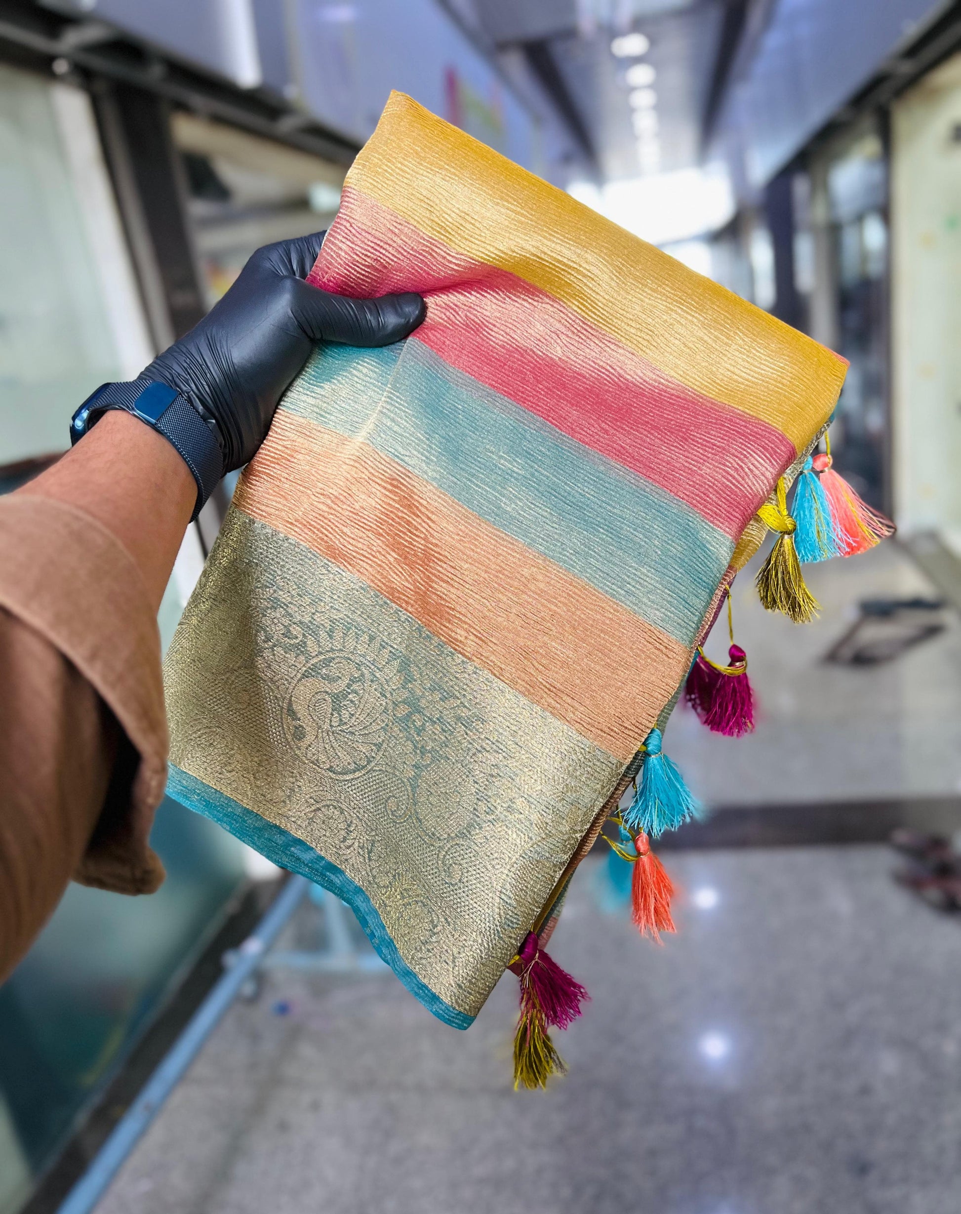 Work :- multi colour body crushing with hand made tassels fumka on pallu