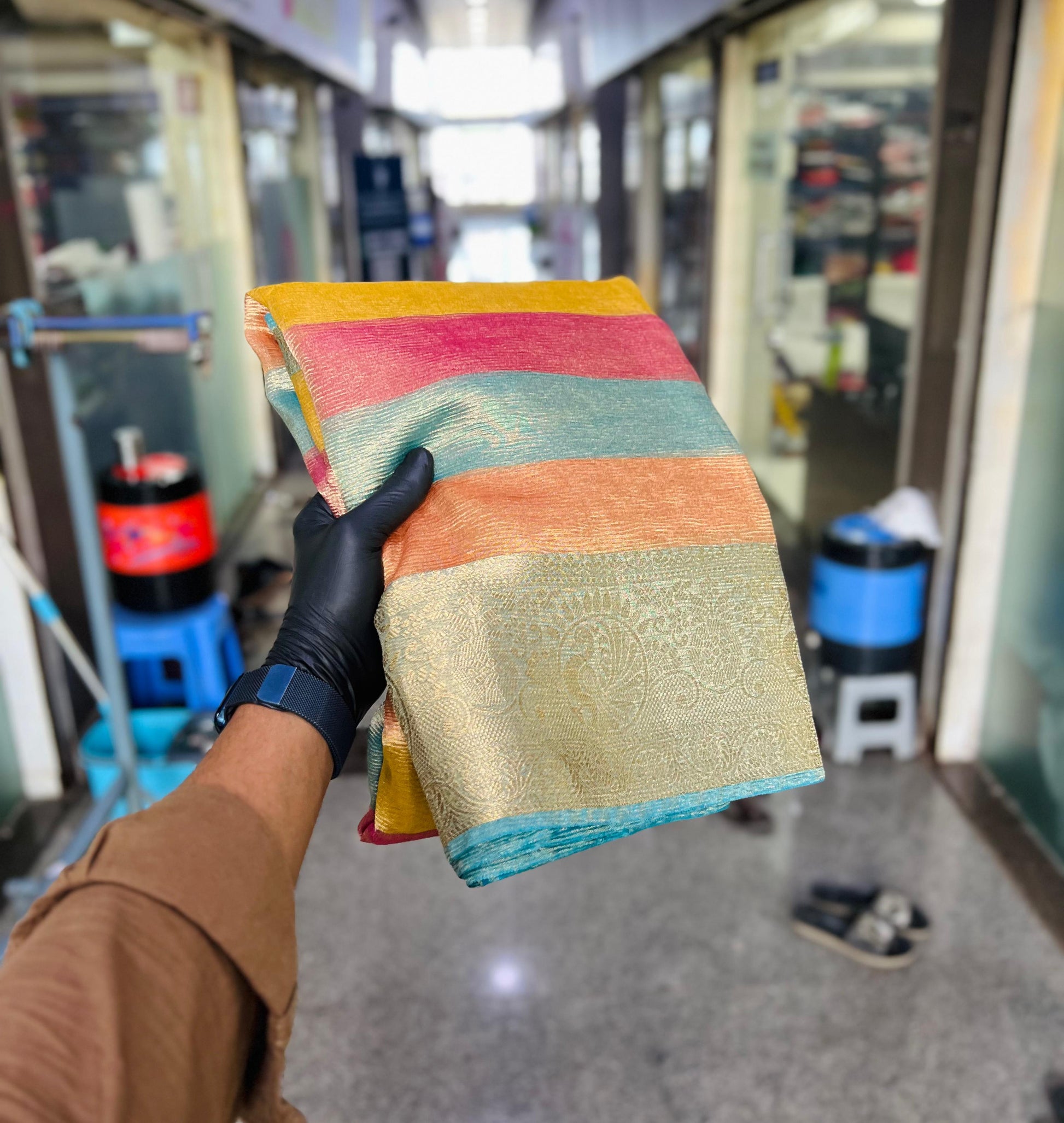 Fabric ditels :-Pure Crush Tisu Silk jari Jaqurad Weveing Border, multiple colour body with chit pallu running blouse piece