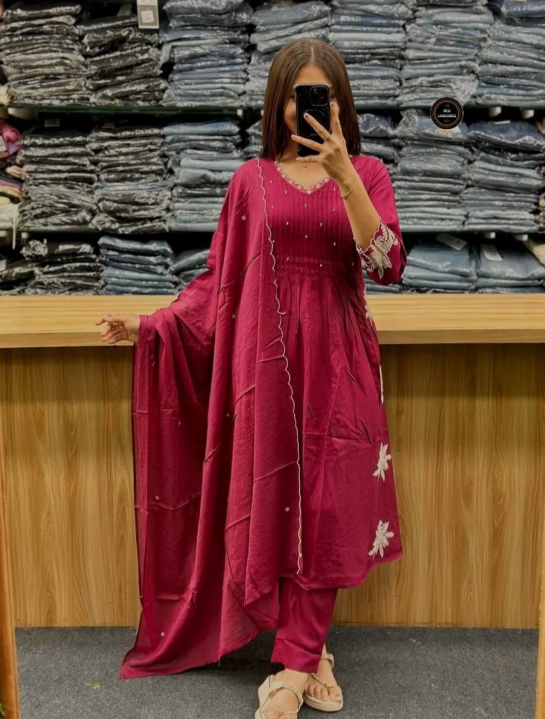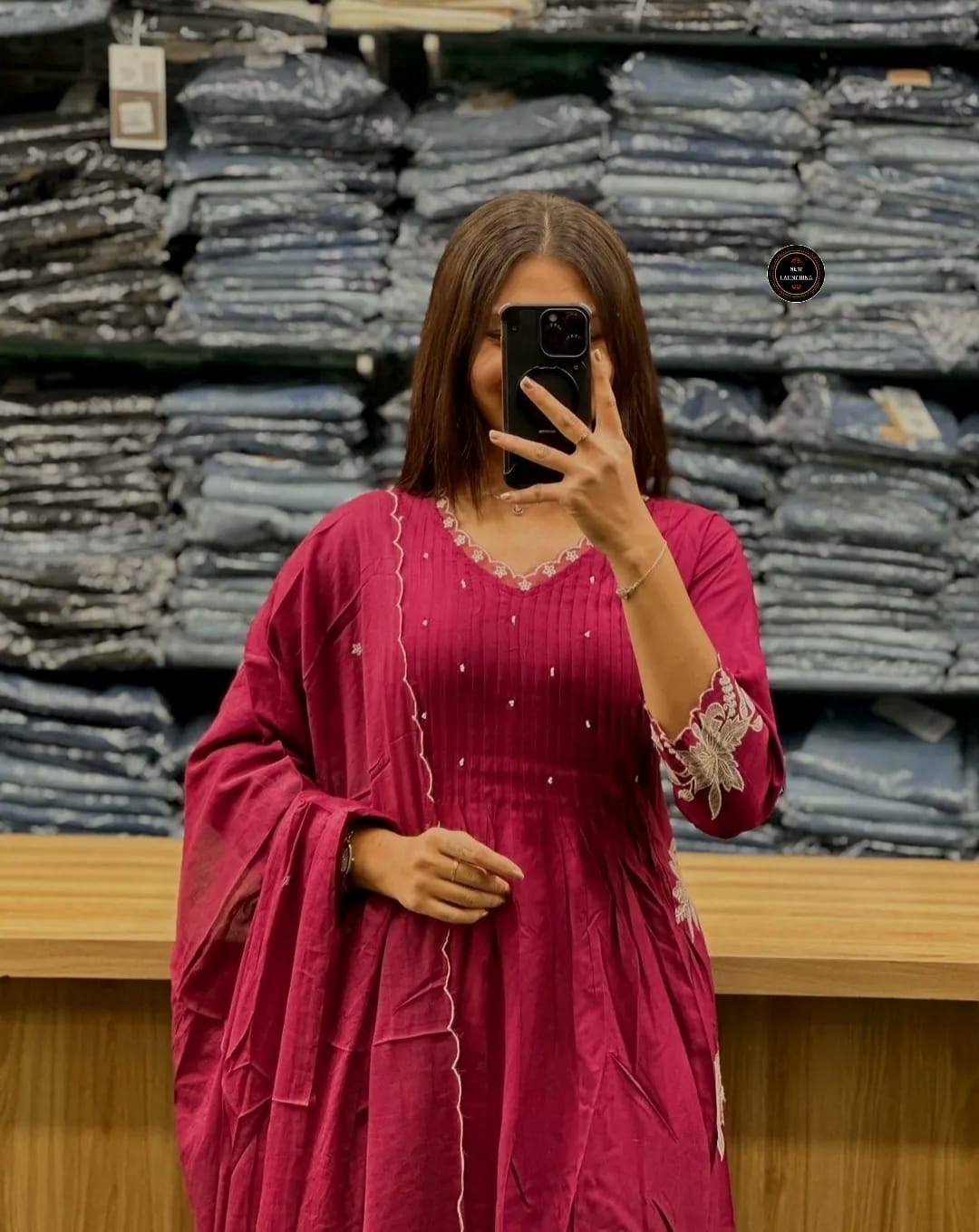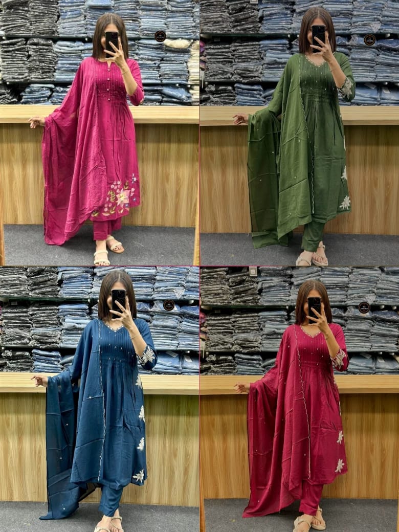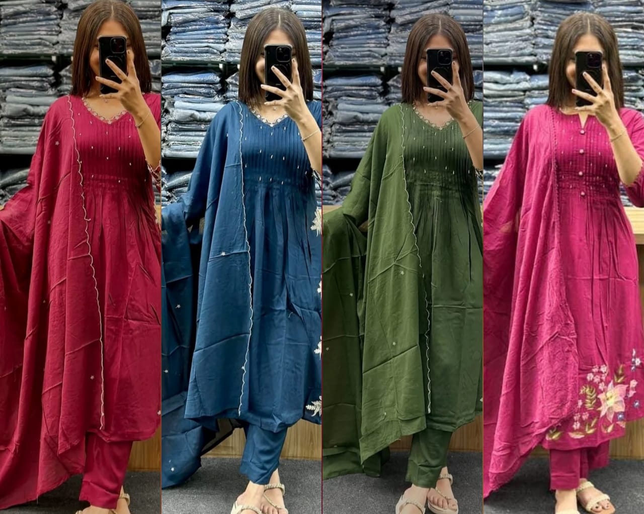*๐Women's Embroidered work Cotton kurta & pant with malmal dupatta set*