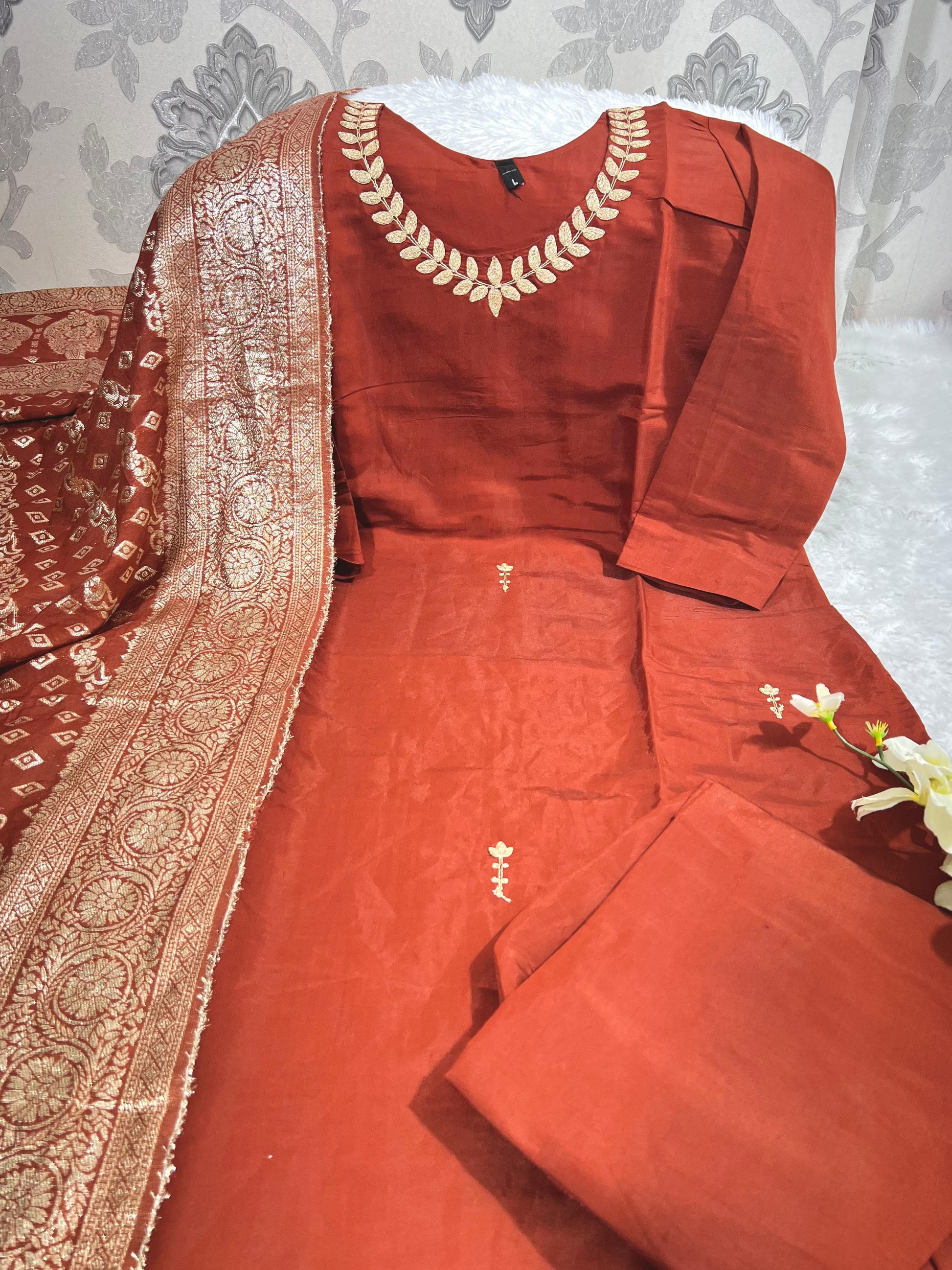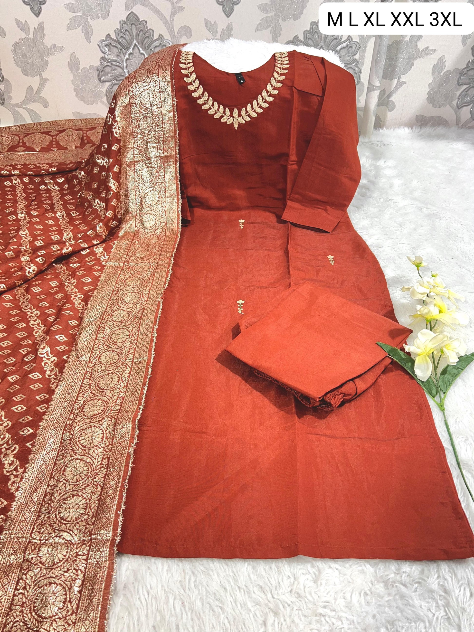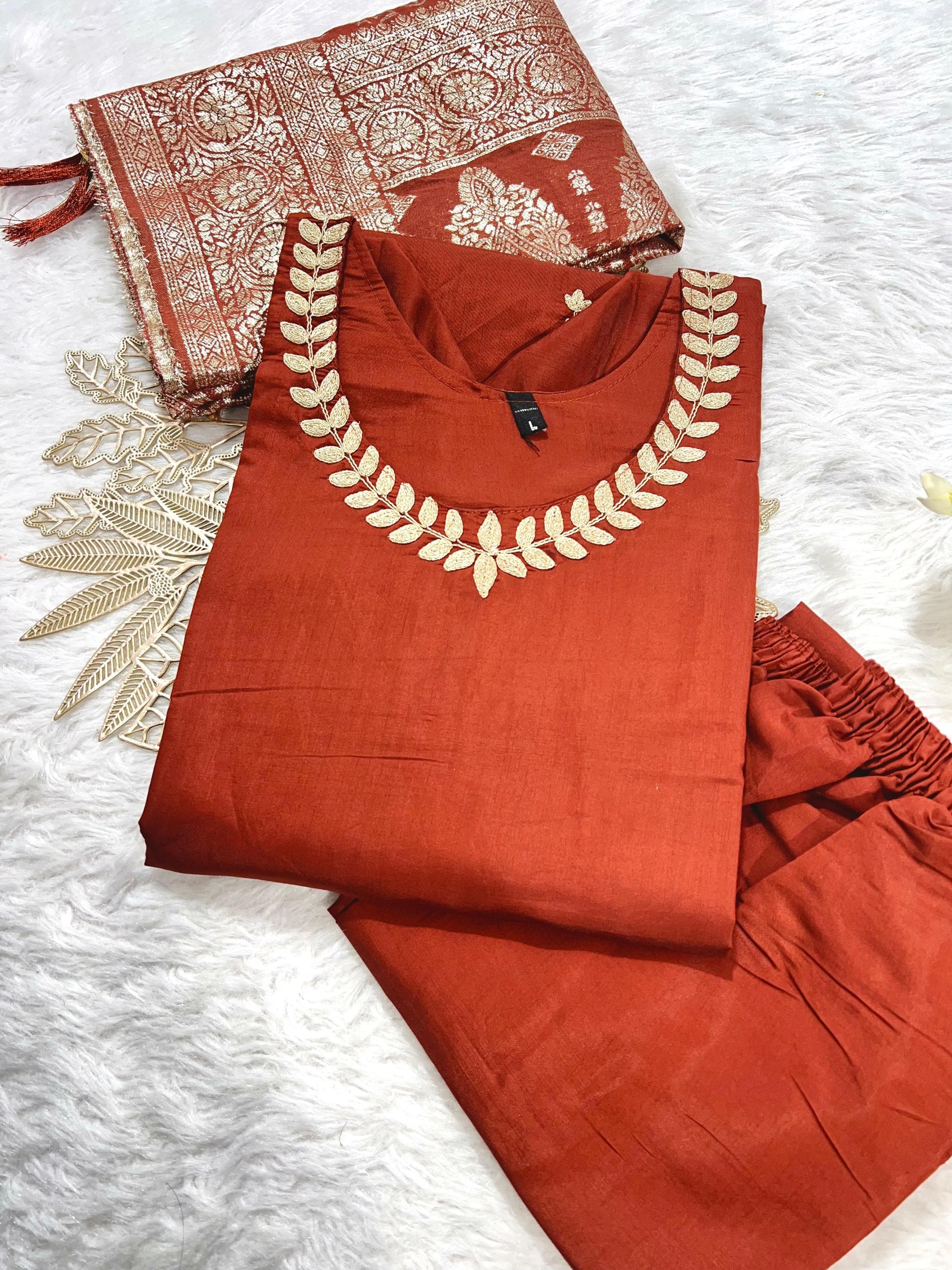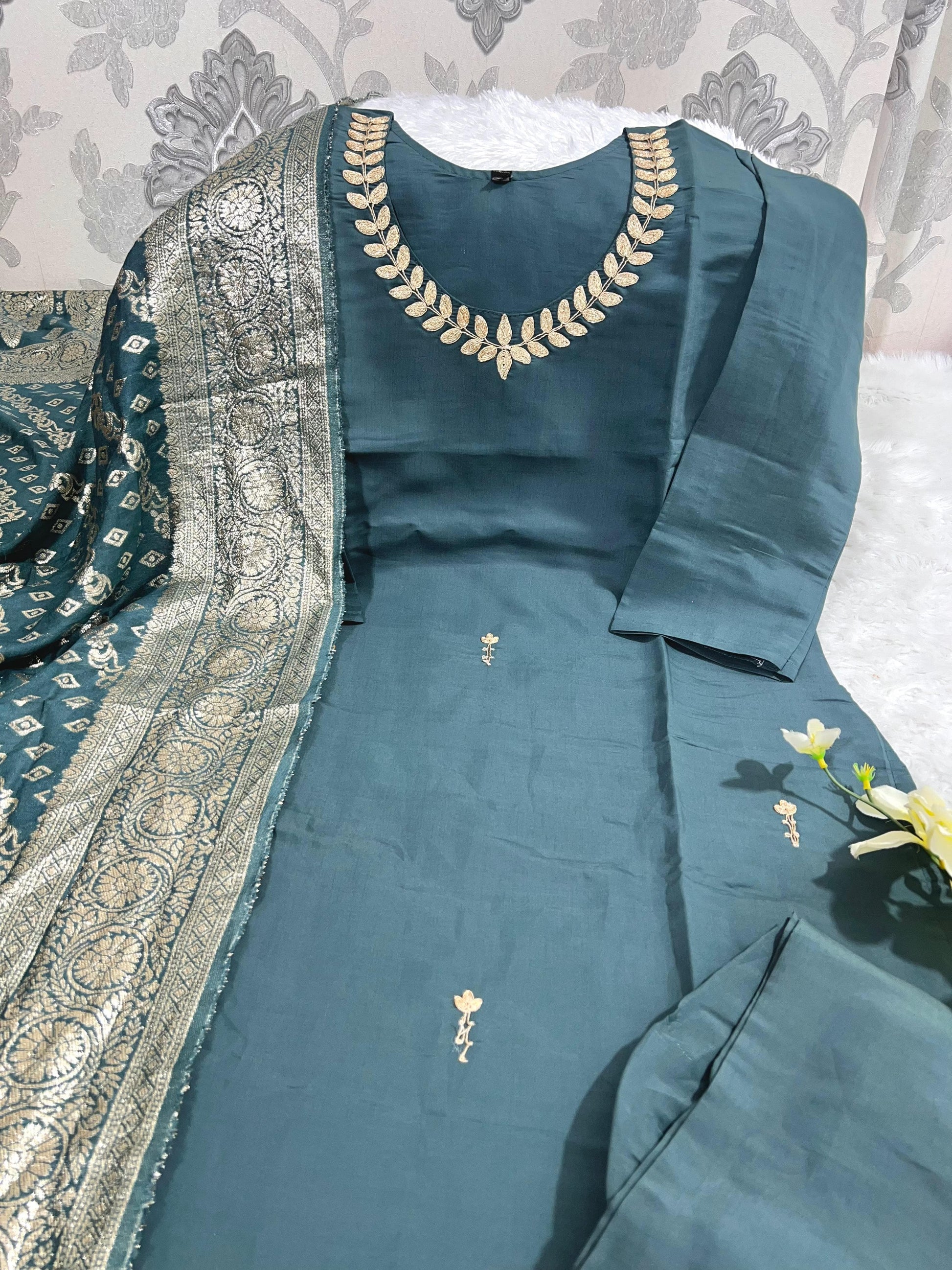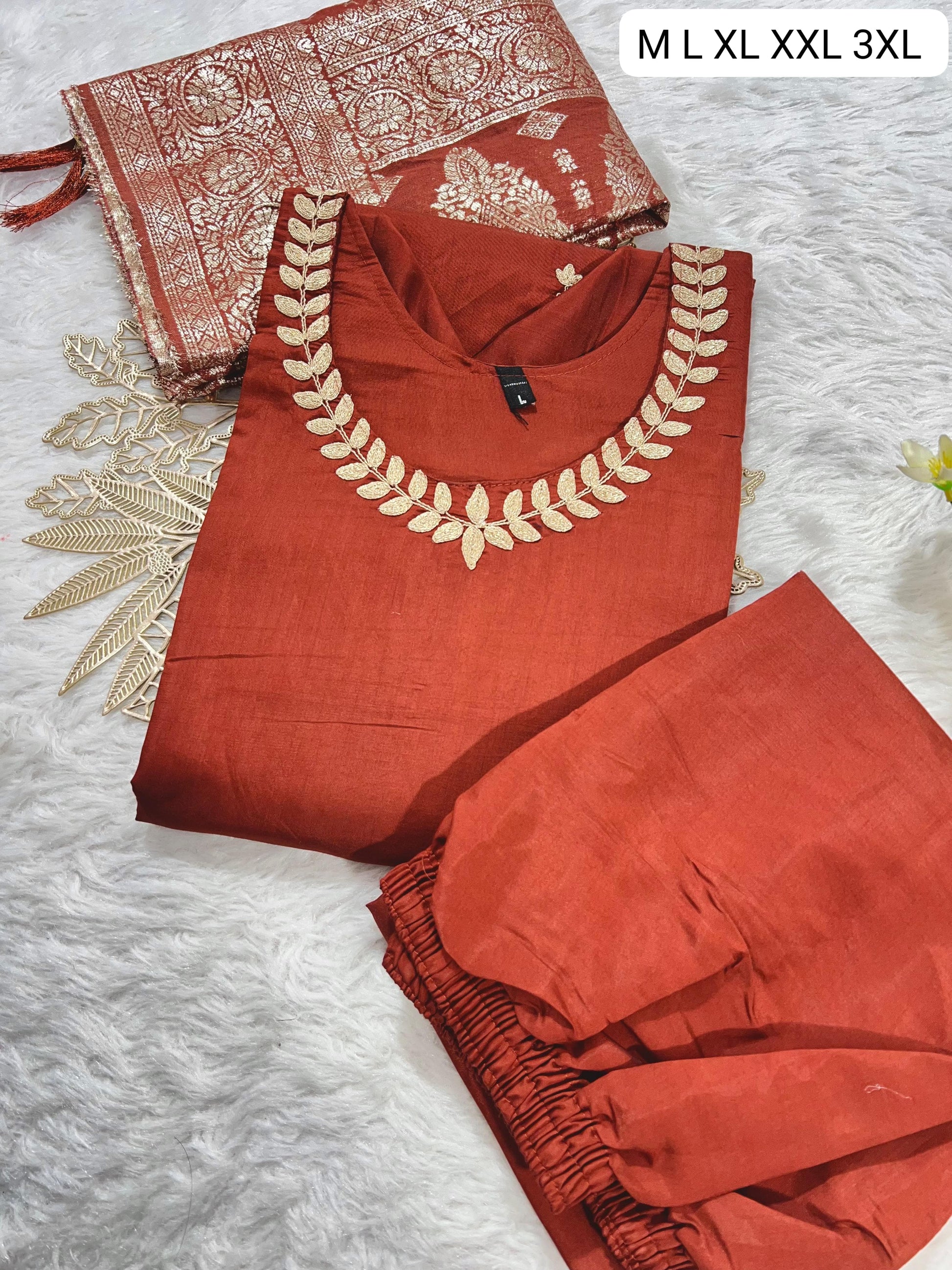 Premium Roman SilK Round Neck Kurti With Pant and z-card Duppata With four side traditional LatkaN