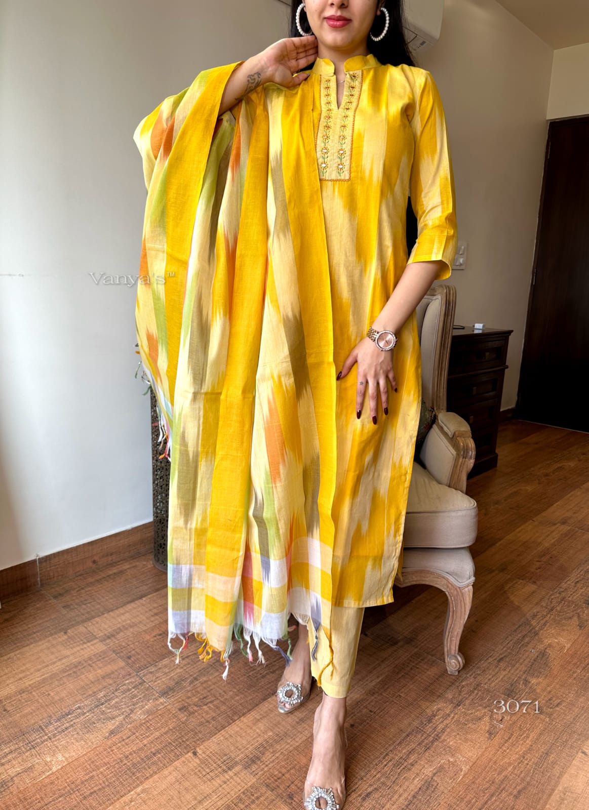 Explore this onam with this beautiful off-white gold hand block combination 3 pcs attire. Pure cotton based thread kota Doria gold hand block kurta( full cotton lining) with matching cotton pant Paired gold printed hand block kota Doria duppata