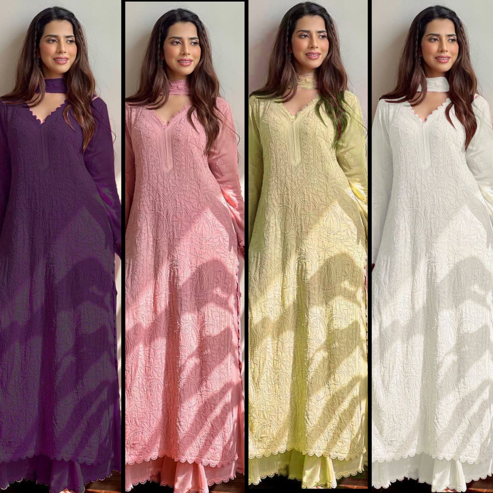 *RUNNING WEAR TRENDING FAUX GEORGETTE TOP COTTON THREAD EMBROIDERED WORK AND WORK PLAZO WITH DUPATTA