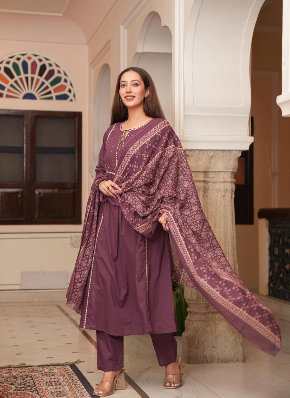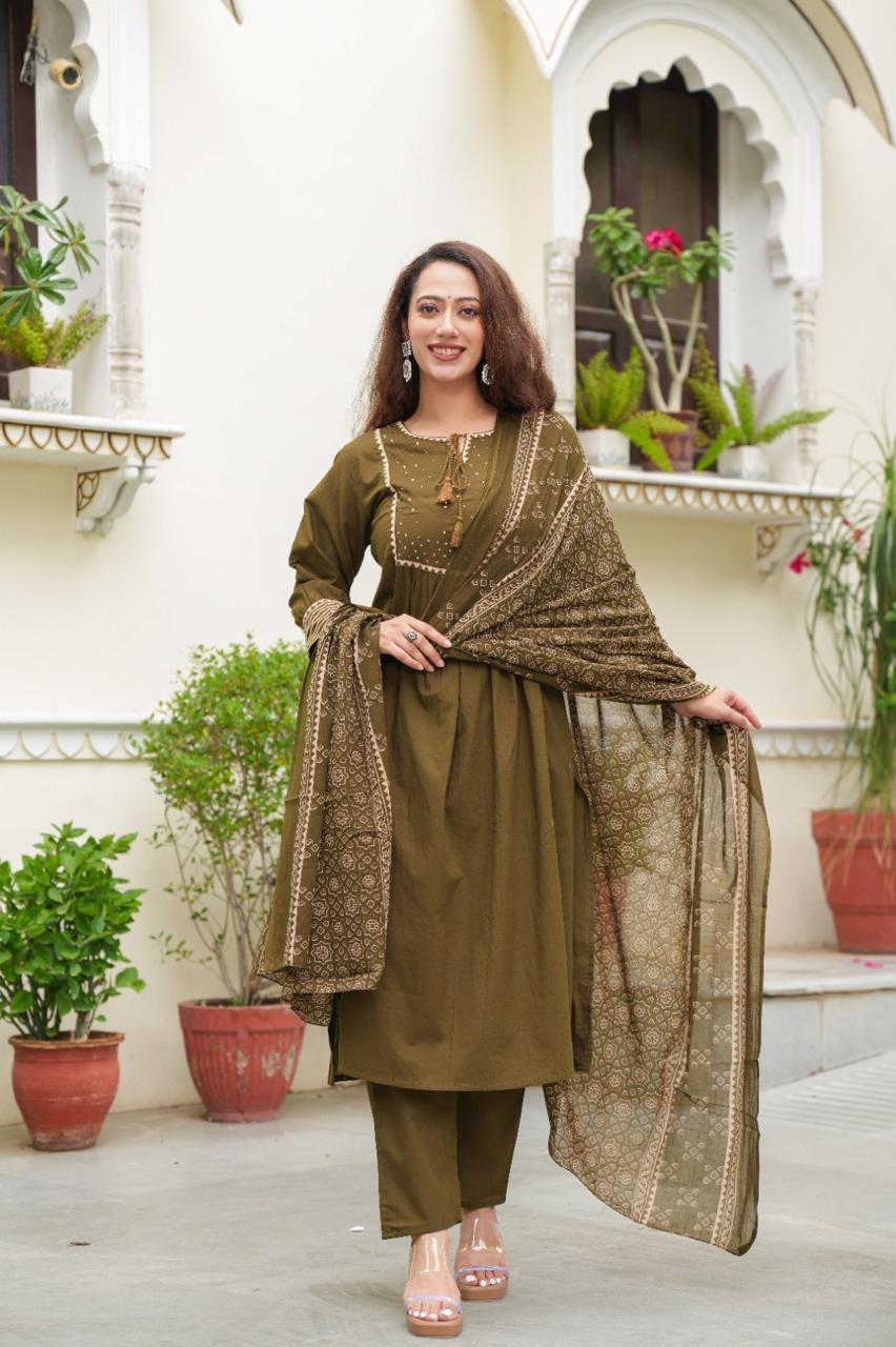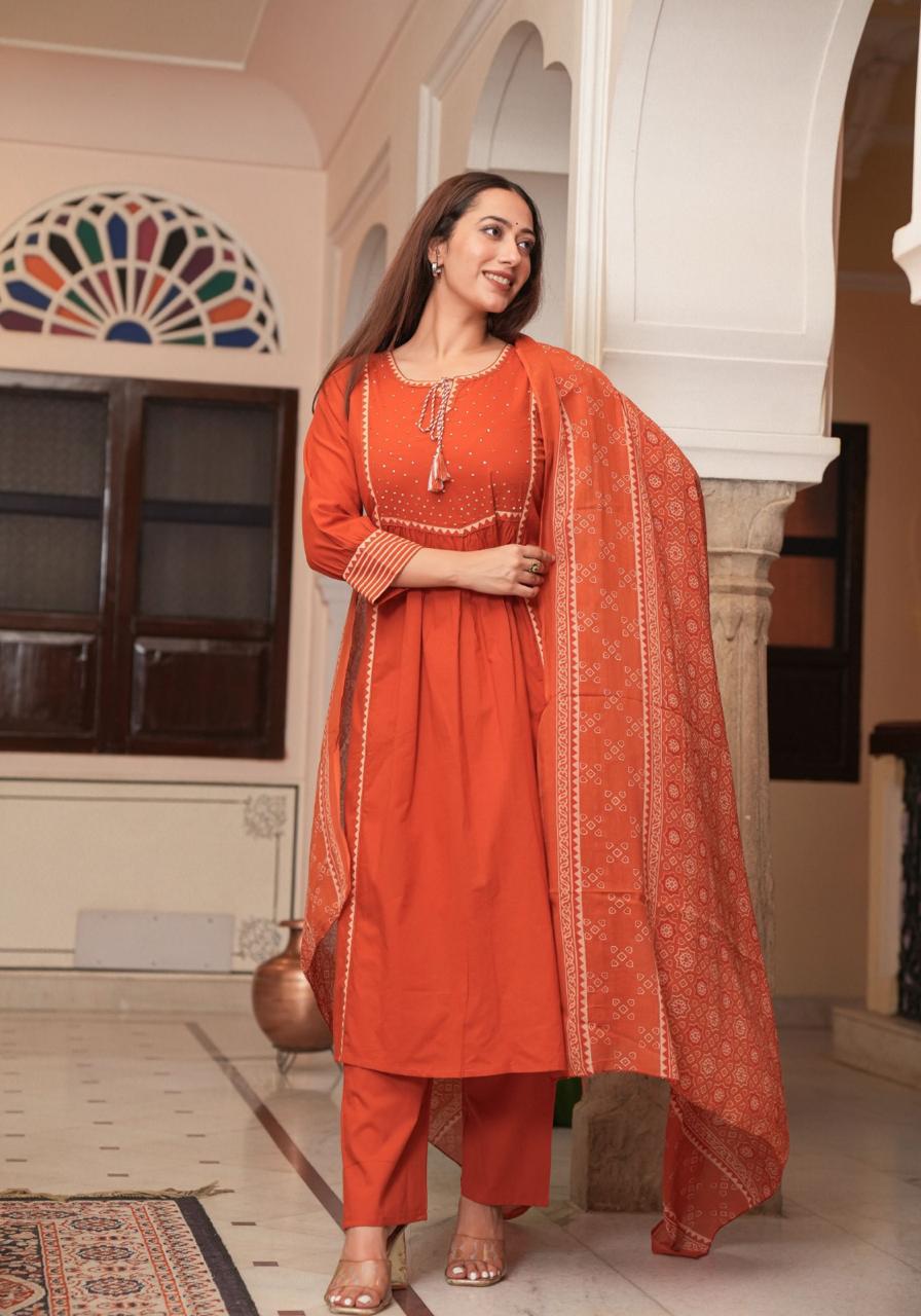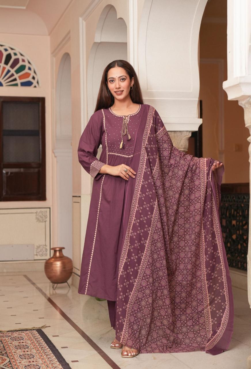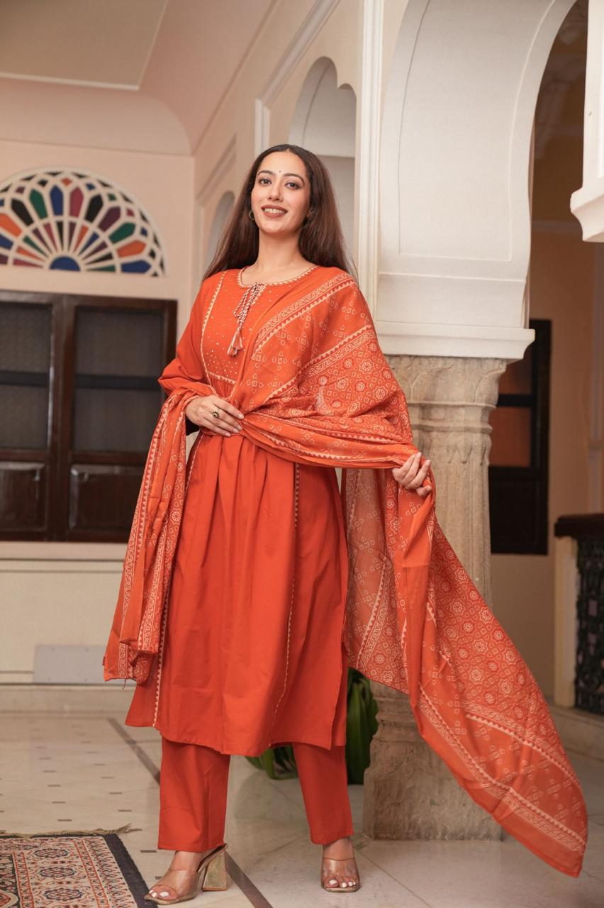 *Premium Quality Cotton Cambric Semi-Anarkali Printed kurti with Beautiful Hand Dori work Cotton Dyed Pant and Full size Cotton Printed Dupatta (2.5m).*